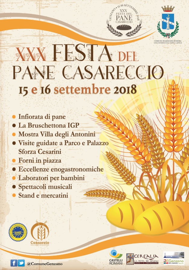 25 agosto h.15:30 – Si rinnova l’appuntamento con la Festa del pane casareccio, un inno alla tradizione, alle cose semplici ma genuine. Giunta alla sua XXX edizione, la manifestazione – organizzata dal Comune di Genzano di Roma in collaborazione con il Consorzio del Pane Casareccio IGP, il Festival Cerealia e le associazioni dei Commercianti e Rete Imprese di Genzano – si terrà il 15 e il 16 settembre. Il nostro pane – il primo in Italia ad essere insignito del marchio IGP dall’Unione europea, nel 1997 – si caratterizza per la crosta croccante e il cuore morbido. Per assaggiarlo in tutte le sue varietà ogni anno nel mese di settembre ne celebriamo il valore in occasione della Festa del Pane, manifestazione che quest’anno festeggia la XXXesima edizione. Degustazioni, visite guidate al Palazzo Sforza Cesarini e il suo incantevole parco, concerti, mostre e mercatini all’interno dei luoghi simbolo della città. Durante i due giorni sarà possibile ammirare l’Infiorata di pane: quadri rappresentativi del mondo del pane realizzati con la tecnica della tradizionale Infiorata ma utilizzando materiale vegetale.