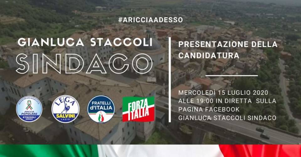 “Ariccia: domani 15 luglio, alle ore 19, presentazione ufficiale online del candidato sindaco del Centrodestra Gianluca Staccoli