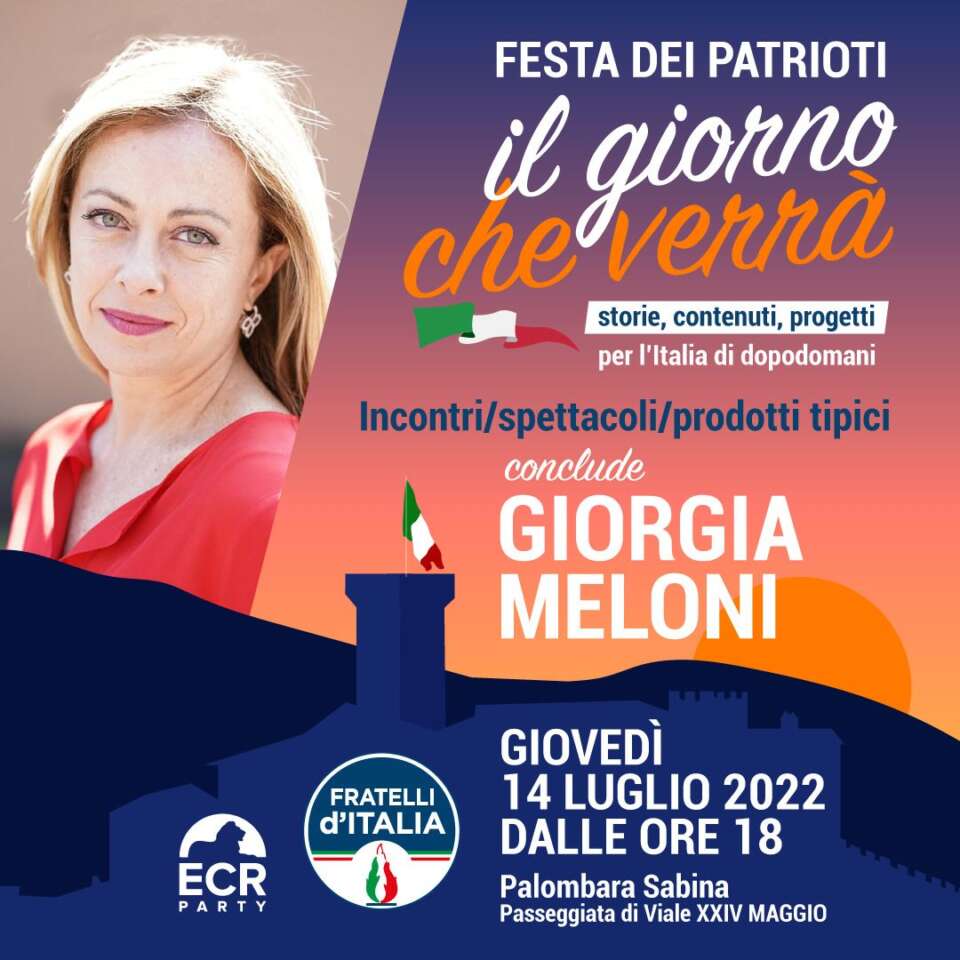 Torna a Palombara Sabina il tradizionale appuntamento promosso dalla Federazione della Provincia di Roma di Fratelli d’Italia: Festa dei Patrioti, l’anno che verra’. Dibattiti, incontri, approfondimenti, prodotti tipici e convivialita’, impreziositi anche in questa edizione dalla pesenza di Giorgia Meloni che interverra’ in piazza alle ore 20:00. Ricco il cartellone dei tavoli e degli interventi con prestigiosi ospiti del mondo delle professioni , della cultura, dello sport, dell’imprenditoria e del lavoro. Nella giornata di giovedi 14 luglio sara’ presente tutta la classe dirigente del partito tricolore della Provincia di Roma: a partire dai Sindaci neo eletti nell’ultima tornata elettorale di giugno. A fare da padrone di casa il Sindaco di Palombara Sabina e Capogruppo in citta’ Metropolitana Alessandro Palombi. Ad inaugurare la festa l’Onorevole Marco Silvestroni deputato e Presidente Provinciale di FdI unitamente al capogruppo a Montecitorio Francesco Lollobrigida e dal suo omologo al Senato Luca Ciriani. Con questo appuntamento di fatto Fratelli d’italia lancia la sua sfida in vista delle elezioni politiche 2023, ma soprattutto per conquistare la Regione Lazio. Ne e’ convinto il Consigliere Regionale Giancarlo Righini, tra i primi a credere nel progetto di Giorgia Meloni nel 2013, oggi tra i piu’ importanti dirigenti di quello che per tutti i sondaggi e’ il primo partito in Italia e nel Lazio, anche lui presente nella serata tra i relatori che interverranno.