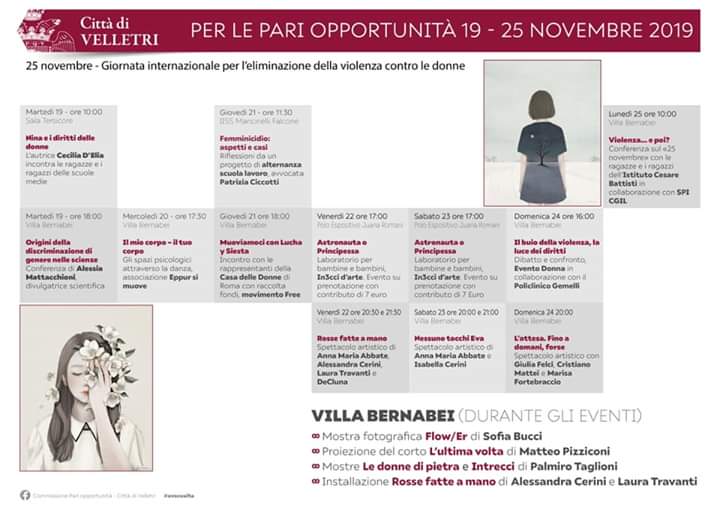 In occasione della Giornata Internazionale per l’Eliminazione della Violenza contro le Donne, l’Associazione Evento Donna in collaborazione con l’Assessorato e la Commissione per le Pari Opportunità del Comune di Velletri sarà presente domenica 24 novembre dalle ore 16,00 alle 19,00 presso la prestigiosa Villa Bernabei con la giornata evento “Il Buio della violenza, la Luce dei diritti” per sensibilizzare ed approfondire i temi riguardanti: l’uguaglianza e la parità di genere; i pregiudizi e stereotipi in genere; la tutela dei diritti e la violenza sulle donne. Sarà un pomeriggio informativo, poliedrico, culturale, e creativo con dibattiti, interviste, momenti musicali ed artistici. Condurrà la giornata la giornalista Maria Grazia Tetti insieme allo psichiatra della Fondazione Universitaria A. Gemelli Prof. Lucio Rinaldi, interverranno diversi ospiti illustri e competenti in materia di diritto di famiglia, delle persone, dei minori e delle donne vittime di violenza, psichiatri, sociologi, psicoterapeuti, assistenti sociali e rappresentanti delle forze dell’ordine nazionale, artisti, cantanti, e scrittori e anche le associazioni di settore. Tutti uniti per dire #no alla violenza sulle donne.
