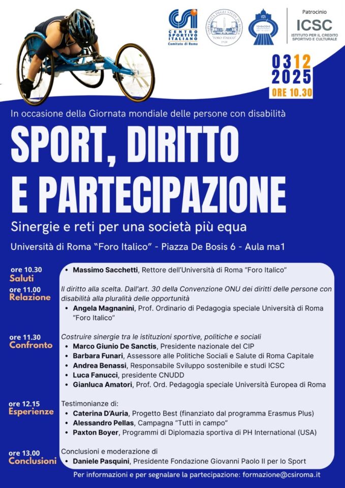 “Mercoledì 3 dicembre 2025, in occasione della Giornata mondiale delle persone con disabilità, il Centro Sportivo Italiano (CSI Roma), la Fondazione Giovanni Paolo II per lo Sport e l’Università di Roma “Foro Italico”, con il patrocinio dell’Istituto per il Credito Sportivo e Culturale (ICSC), organizzano l’evento “Sport, diritto e partecipazione. Sinergie e reti per una società più equa”.