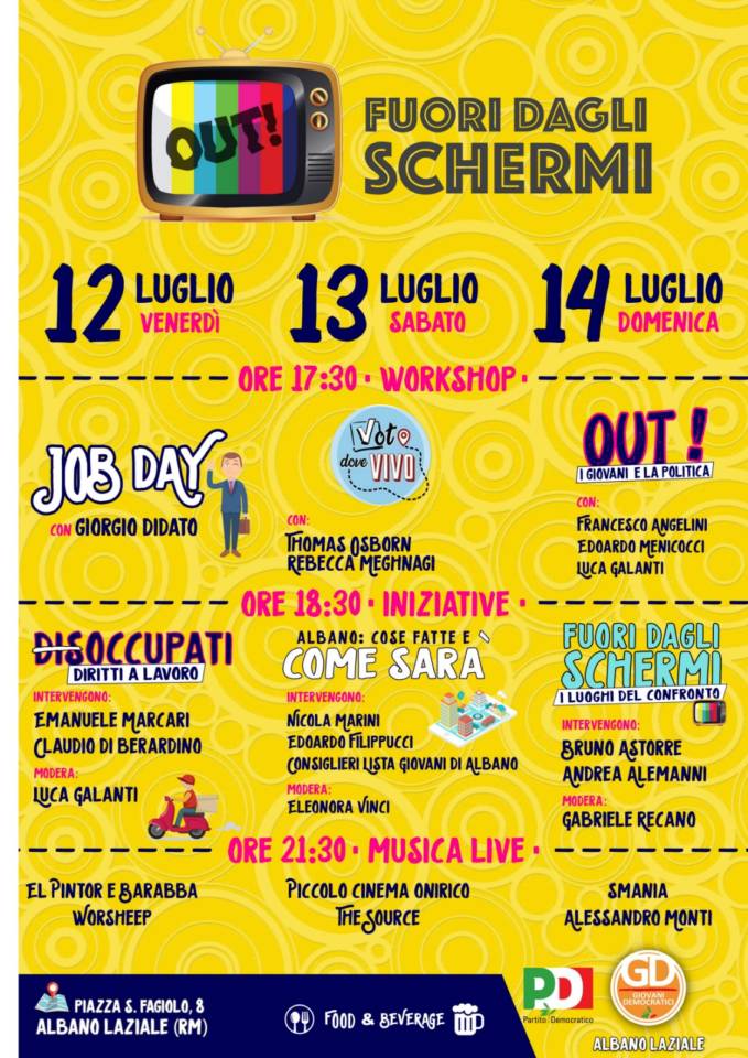 Nasce quindi “Out-Fuori dagli Schermi”, iniziativa di tre giorni, 12, 13 e 14 luglio, in piazza S. Fagiolo, ad Albano, dove a workshop e dibattiti di carattere politico sulle tematiche più importanti che interessano il vivere civile di giovani e meno giovani, si uniranno momenti conviviali, esibizioni di gruppi musicali emergenti del nostro territorio e giochi da condividere tutti insieme.