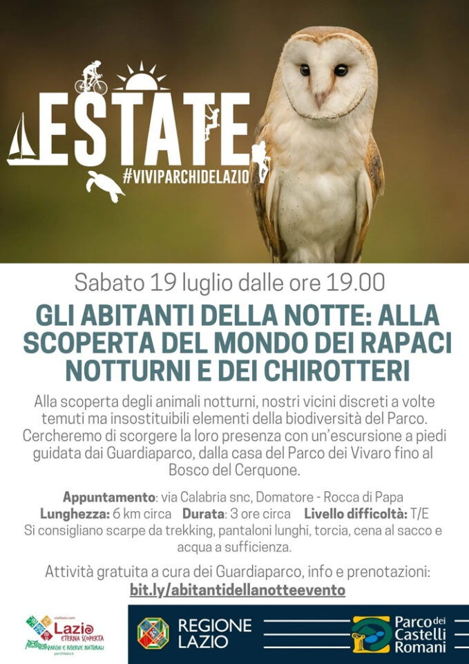 Si partirà dalla casa del Parco – via Calabria snc, Domatore – Rocca di Papa (RM), per un’escursione a piedi dal Vivaro fino al bosco del Cerquone, alla scoperta degli animali notturni, nostri vicini discreti, a volte temuti, ma insostituibili elementi della biodiversità del Parco. Tutti i dettagli sono disponibili nella locandina .