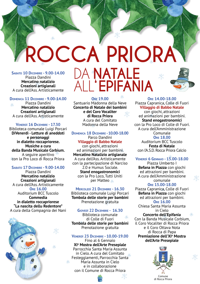 Si è aperto la scorsa settimana il ricco cartellone di eventi natalizi di Rocca Priora. Per questo weekend (Venerdì 16) appuntamento culturale con il “Di Venerdì”: tornano le letture in dialetto roccapriorese accompagnate dalla musica della Banda Musicale Corbium. Sabato 17 sarà la volta della commedia in dialetto “La nascita dellu Redentore” e, in serata, del Concerto di Natale dei bambini e del Coro Vocaliter di Rocca Priora. Sabato 17 e Domenica 18, a Piazza Dandini, sono previsti anche i Mercatini Natalizi e le creazioni artigianali. Ma i veri protagonisti del Natale di Rocca Priora saranno i più piccoli che potranno visitare. Domenica 18 nel Parco Dandini il Villaggio di Babbo Natale con giochi, attrazioni ed animazione (l’evento verrà replicato anche a Colle di Fuori Venerdì 23 Dicembre). Mercoledì 21 e Giovedì 22 nella Biblioteca Luigi Porcari di Rocca Priora e in quella di Colle di Fuori appuntamento con la “Tombola delle storie per bambini”. “Festeggiare il Natale tra bambini, musica e cultura dà il senso della strada intrapresa da questa Amministrazione – spiega il Sindaco di Rocca Priora, Damiano Pucci. – Il Natale è un’occasione per dimostrare come Rocca Priora sia attenta alle tradizioni, in un percorso di riscoperta dell’intero territorio e delle sue peculiarità”. Venerdì 23 Dicembre, invece, verrà inaugurata l’XIª Mostra dell’Arte Presepiale nella Parrocchia Santa Maria Assunta in Cielo. Le premiazioni di quest’ultimo evento avverranno nel giorno dell’Epifania, Venerdì 6 Gennaio. Nello stesso giorno, nel primo pomeriggio, appuntamento in centro storico e a Colle di Fuori con “La Befana in Piazza”: previsti giochi ed animazione per i più piccoli in Piazza Umberto I e in Piazza Capranica. Alle ore 16.00 grande “Concerto dell’Epifania” con la Banda Musicale Corbium, il Coro Vocaliter di Rocca Priora e il Coro Ottava Nota di Rocca di Papa. Non mancheranno gli eventi sportivi: Venerdì 23 Dicembre appuntamento con l’A.S.D. Rocca Priora Calcio per la “Festa di Natale”. “Sarà un Natale ricco di eventi, un Natale per tutti i gusti – aggiunge l’Assessore alle politiche cuturali, Federica Lavalle. – Desidero ringraziare tutti i cittadini e tutte le associazioni del territorio che hanno