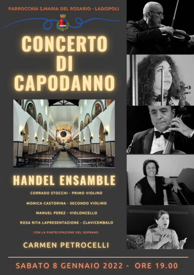 L’Assessorato alla Cultura del Comune di Ladispoli annuncia il prossimo concerto di capodanno, che si terrà presso la Parrocchia Santa Maria del Rosario di via Duca degli Abruzzi, 190.