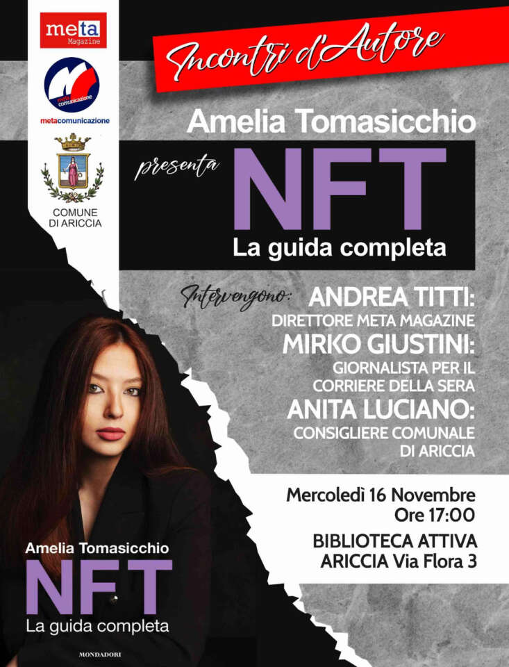 Di tutto questo si parlerà alla presentazione del libro: “NFT – Guida Completa”, mercoledì 16 Novembre, a partire dalle ore 17:00, presso la Biblioteca Attiva di Ariccia, sita in Via Flora 3. Ne discuteranno, insieme all’autrice Amelia Tomasicchio, Andrea Titti, Direttore di Meta Magazine, e Mirko Giustini, giornalista per Il Corriere della Sera. L’appuntamento, patrocinato dal Comune di Ariccia, vedrà la presenza anche della Consigliera Comunale Anita Luciano, che porterà i saluti dell’amministrazione comunale.