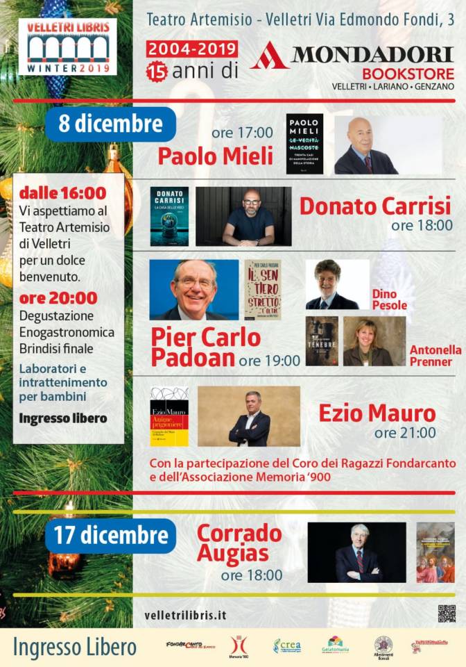 Un grande evento per festeggiare i quindici anni di attività della Libreria Mondadori Bookstore sul territorio. Domenica 8 dicembre al Teatro Artemisio-Volonté, a partire dalle ore 16.00, avrà luogo una vera e propria maratona dopo un dolce benvenuto che vedrà ospiti diversi autori, tutti di primissimo livello nel panorama culturale, televisivo e politico italiano. Alle ore 17.00 Paolo Mieli presenterà il suo ultimo saggio “Le verità nascoste” (Rizzoli): il giornalista indaga trenta casi di manipolazione della storia, in una vera e propria inchiesta che sollecita alla riflessione. Alle ore 18.00 sarà la volta di Donato Carrisi, che presenta “La casa delle voci” (Longanesi): un appassionante romanzo che ha come protagonista lo psicologo Pietro Gerber, esperto di ipnosi e con molti pazienti bambini. Si prosegue poi alle ore 19.00 con l’ex ministro Pier Carlo Padoan, insieme al giornalista Dino Pesole e alla professoressa Antonella Prenner: si svolgerà un dibattito tra “Tenebre”, romanzo storico ambientato ai tempi di Cicerone, e “Il sentiero stretto”, un lucido saggio sulle necessità economiche del Paese nato a seguito di una conversazione/intervista tra Pesole e Padoan. Alle ore 20.00 break con una degustazione enogastronomica nel foyer del Teatro, mentre i bambini saranno impegnati tutto il pomeriggio con i laboratori e l’intrattenimento di Fantanimazione e una splendida Casa di Babbo Natale allestita nella piazzetta antistante l’Artemisio-Volonté. Alle ore 21.00 ultimo ospite della maratona, Ezio Mauro, per una conversazione che sarà anticipata dall’esibizione del coro dei ragazzi FondarCanto e si terrà in collaborazione con l’Associazione Memoria ‘900. Mauro in “Anime prigioniere” analizza e ripercorre le tappe che condussero alla caduta del Muro di Berlino, di cui quest’anno ricorrono i trenta anni. Un programma davvero ricco – naturalmente ad ingresso libero – per festeggiare al meglio quindici anni di cultura ed emozioni con Mondadori sotto il marchio di “Velletri Libris Winter 2019”. E per il 17 dicembre (ore 18.00) sempre in teatro c’è già in programma un altro imperdibile incontro con Corrado Augias. Intanto, però, l’appuntamento è per l’8 dicembre dalle 17.00 in poi con una splendida giornata ricca di temi e di ospiti.