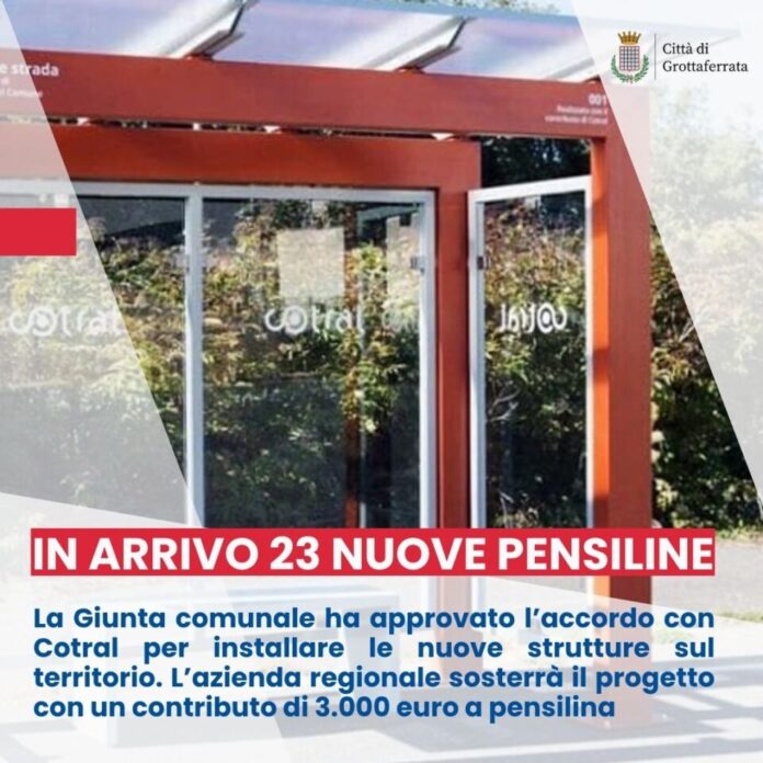 La Giunta comunale di Grottaferrata con la Delibera n. 161 del 24.06.2025 ha approvato l’accordo con l’azienda Cotral per l’installazione di 23 nuove pensiline per il trasporto pubblico nelle aree comunali. Le nuove strutture, moderne e funzionali, saranno realizzate e posizionate dal Comune, che ha ottenuto il progetto tecnico e la licenza per l’utilizzo del marchio e del design dell’azienda. Cotral dal canto suo sosterrà il progetto con un contributo economico di 3.000 euro (oltre IVA) per ogni pensilina installata. I lavori di sostituzione sono previsti per fine di settembre.