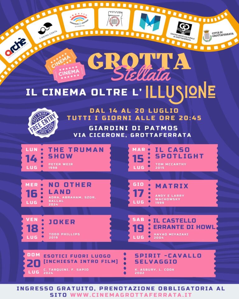 Prende il via la quarta edizione della rassegna cinematografica “GrottaStellata – Il cinema oltre l’illusione”, un progetto dell’Associazione Archè APS, realizzato in collaborazione con il Consiglio dei Giovani di Grottaferrata, L’Anima Conta e la Pro Loco di Grottaferrata, con il sostegno e il patrocinio del Comune di Grottaferrata. Dal 14 al 20 luglio 2025, ogni sera alle ore 20:45, lo spazio dei Giardini di Patmos si trasformerà in un’arena di visioni condivise sotto le stelle. Tutti gli appuntamenti sono gratuiti, con prenotazione obbligatoria tramite il sito: www.cinemagrottaferrata.it.