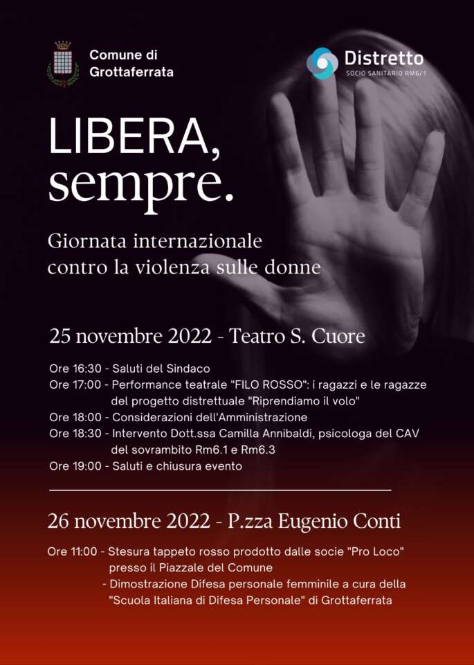 L’Amministrazione comunale, in collaborazione con il Distretto socio-sanitario Rm 6.1, di cui Grottaferrata è Comune capofila, ha organizzato per le giornate del 25 e del 26 novembre 2022, due importanti iniziative aperte alla partecipazione di tutta la cittadinanza, che porranno un focus sul tema della violenza contro le donne e sulle attività messe in campo dal Centro Antiviolenza nei Comuni del Distretto socio-sanitario Rm 6.1 e 6.3.
