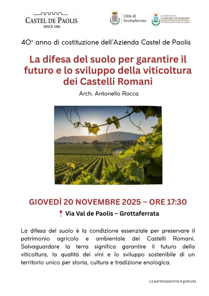 Giovedì 20 novembre 2025, alle ore 17:30, presso Via Val de Paolis – Grottaferrata, si terrà l’incontro dal titolo: “La difesa del suolo per garantire il futuro e lo sviluppo della viticoltura dei Castelli Romani”, a cura dell’Arch. Antonello Rocca.