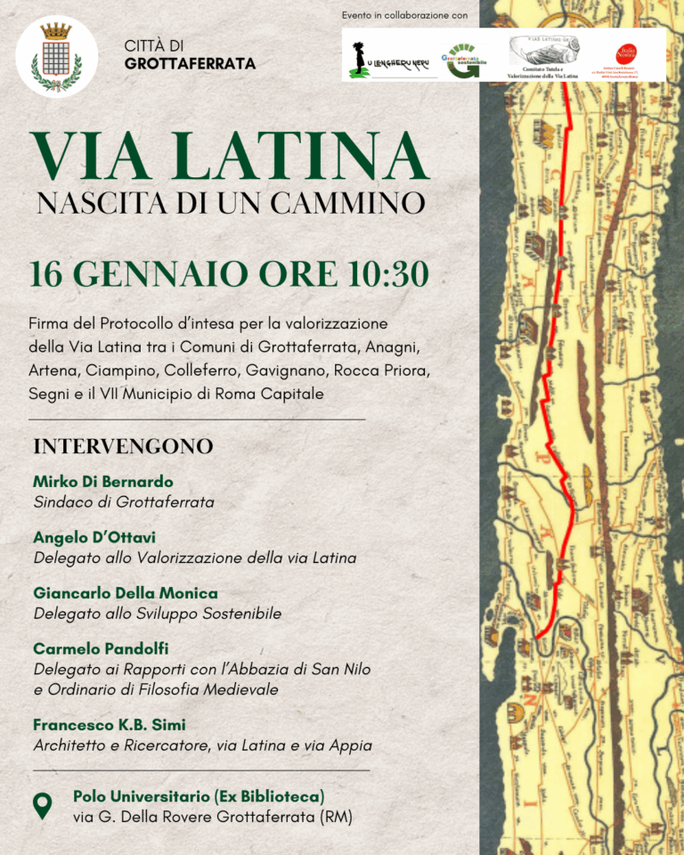 L’Ente regionale Parco dei Castelli Romani lavora con il Comune di Grottaferrata (RM), capofila del Protocollo d’Intesa per la promozione della costituzione del “Cammino della Via Latina” siglato nei giorni scorsi alla presenza di tutti i Soggetti coinvolti (il VII Municipio di Roma Capitale, Ciampino, Rocca Priora, Artena, Colleferro, Segni, Gavignano e Anagni).