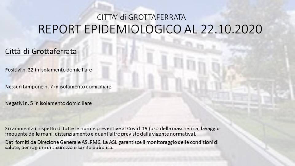 Sul sito web del Comune di Grottaferrata è presente il report relativo ai residenti del Comune di Grottaferrata attualmente positivi che riferisce di 22 cittadini risultati positivi al tampone (dati forniti dalla Asl Rm 6).
