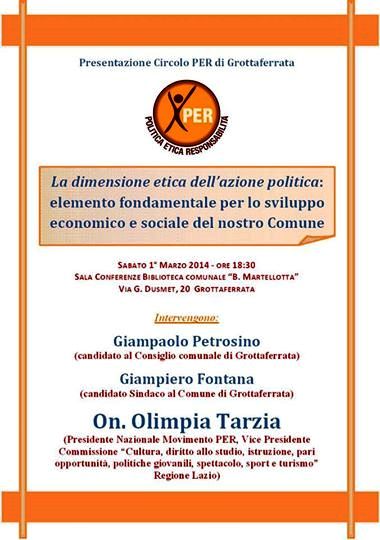 Il neo costituito Circolo “PER” (Politica, Etica, Responsabilità) di Grottaferrata si presenta ai Cittadini domani 1° marzo, alle ore 18.30, presso la Sala polifunzionale della Biblioteca comunale “B. Martellotta”, in Viale Dusmet 20. Tema dell’incontro “La dimensione etica dell’azione politica: elemento fondamentale per lo sviluppo economico e sociale del Nostro Comune”. Coordinerà l’evento l’Ing. Giampaolo PETROSINO, candidato al Consiglio comunale. Presenzierà il candidato Sindaco Giampiero FONTANA. Interverrà la Consigliera regionale del Lazio, Onorevole Olimpia TARZIA, Vice Presidente Commissione Cultura, diritto allo studio, istruzione, pari opportunità, politiche giovanili, spettacolo, sport e turismo, nonché Presidente nazionale del Movimento PER.