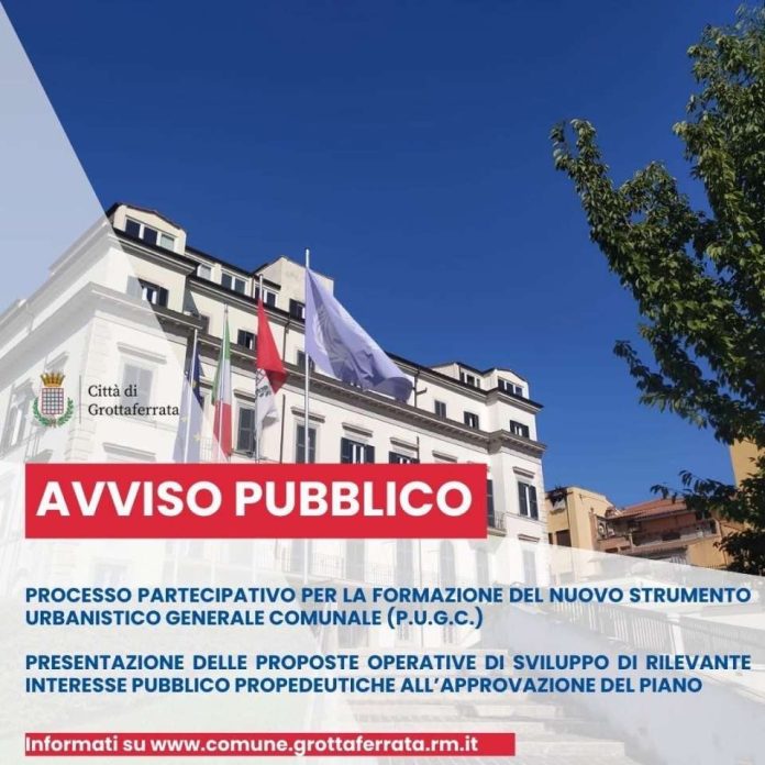 È stato pubblicato l’avviso pubblico per la presentazione delle proposte operative di sviluppo di rilevante interesse pubblico. Un altro tassello del percorso partecipativo, essenziale per la formazione del nuovo Strumento Urbanistico Generale Comunale (P.U.G.C.) di Grottaferrata. Le proposte potranno essere presentate fino al 30 aprile 2025 entro le ore 12:00. «Si tratta di un momento storico per la nostra città», dichiara il Sindaco Mirko Di Bernardo.