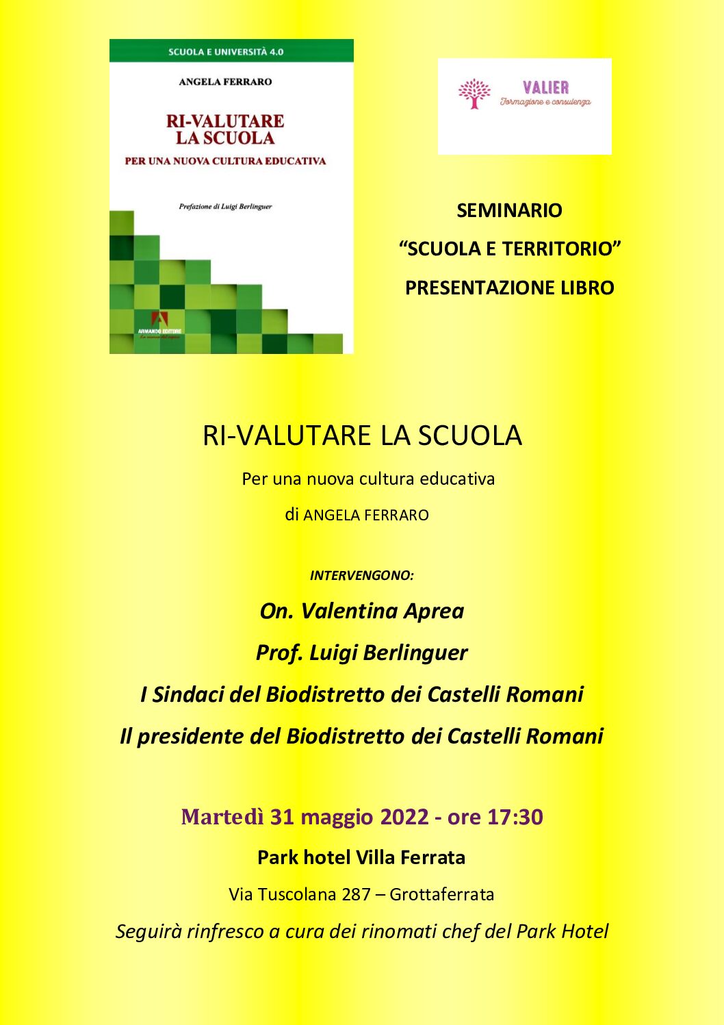 Martedi 31 maggio alle ore 17,30, nel suggestivo ed elegante contesto del Park Hotel Villa Ferrata di Grottaferrata (via Tuscolana 287) verrà presentato il libro edito da Armando Editore, dal titolo Ri-valutare la scuola. Per una nuova cultura educativa in cui l’autrice, professoressa Angela Ferraro, offre una proposta educativa e una visione di scuola attuale e innovativa.