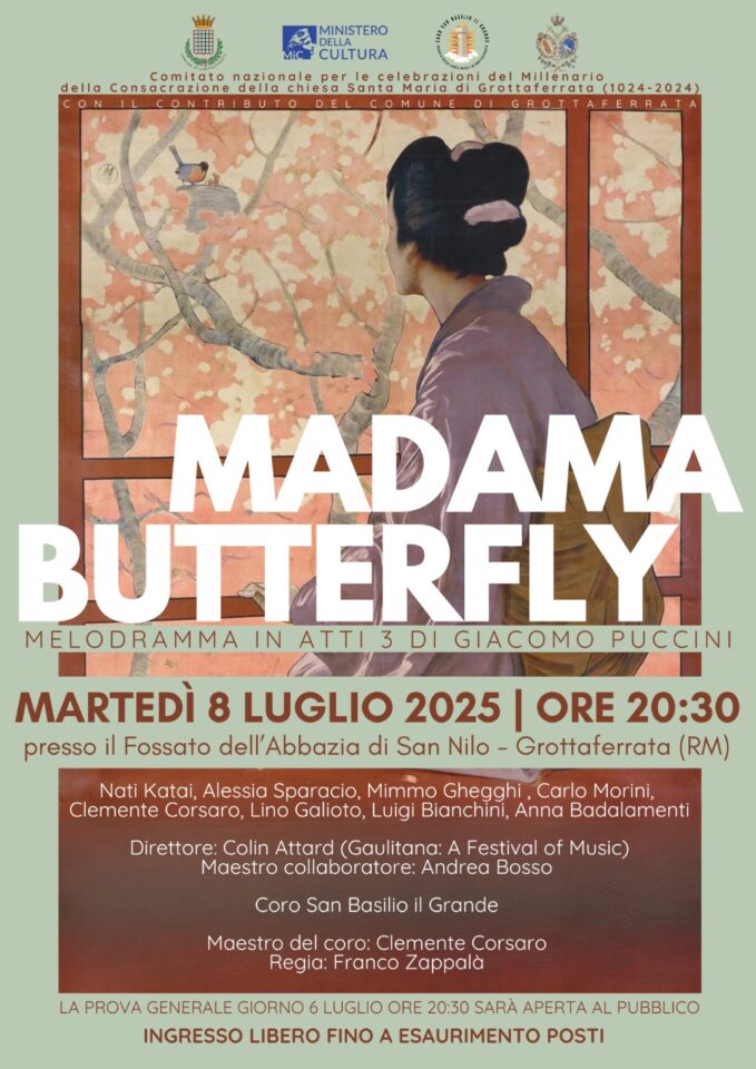 La magia dell’opera lirica incontra la storia millenaria di Grottaferrata. Domenica 6 e martedì 8 luglio il Fossato dell’Abbazia di Santa Maria si trasformerà in un teatro sotto le stelle, pronto ad accogliere la struggente bellezza di “Madama Butterfly”, una delle più famose opere di Giacomo Puccini, un classico della lirica italiana, portato in scena in tutto il mondo. Domenica 6 alle 20:30 sarà possibile partecipare alla prova generale aperta al pubblico: un’esperienza unica per vivere il piacere della preparazione tecnica di uno spettacolo dal vivo. Martedì 8 invece, sempre alle 20:30, ci sarà la prima nazionale della “Madama Butterfly”. Entrambe le serate sono a ingresso è libero fino ad esaurimento posti.