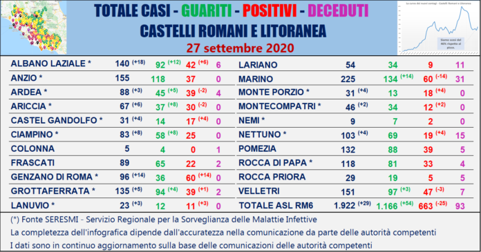 Nella tabella seguente viene riportata la ripartizione dei contagi per singolo comune dei Castelli Romani e della Litoranea sulla base delle comunicazioni ufficiali delle autorità competenti.