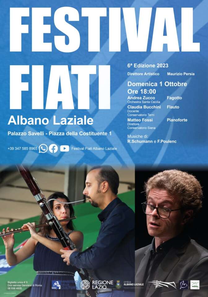 Si alza finalmente il sipario sulla sesta edizione del Festival Fiati Albano Laziale. La Sala Nobile di Palazzo Savelli ospiterà, domenica 1 ottobre alle ore 18, il debutto ufficiale dell’attesa manifestazione concertistica a cura dell’assessorato alla Cultura del Comune di Albano Laziale, organizzata dall’associazione “Luciano Pezzi”, sotto la direzione artistica del Maestro Maurizio Persia. La prima della sesta edizione del Festival Fiati Albano Laziale vedrà protagonisti Andrea Zucco, primo fagotto dell’Orchestra di Santa Cecilia e professore alla Royal Northern College di Manchester, insieme a Claudia Bucchini, docente al Conservatorio di Terni ed ex primo flauto dell’Orchestra Regionale Toscana. Suoneranno musiche di Schumann e Poulenc con il pianista Matteo Fossi, concertista di fama internazionale e direttore del Conservatorio di Siena.
