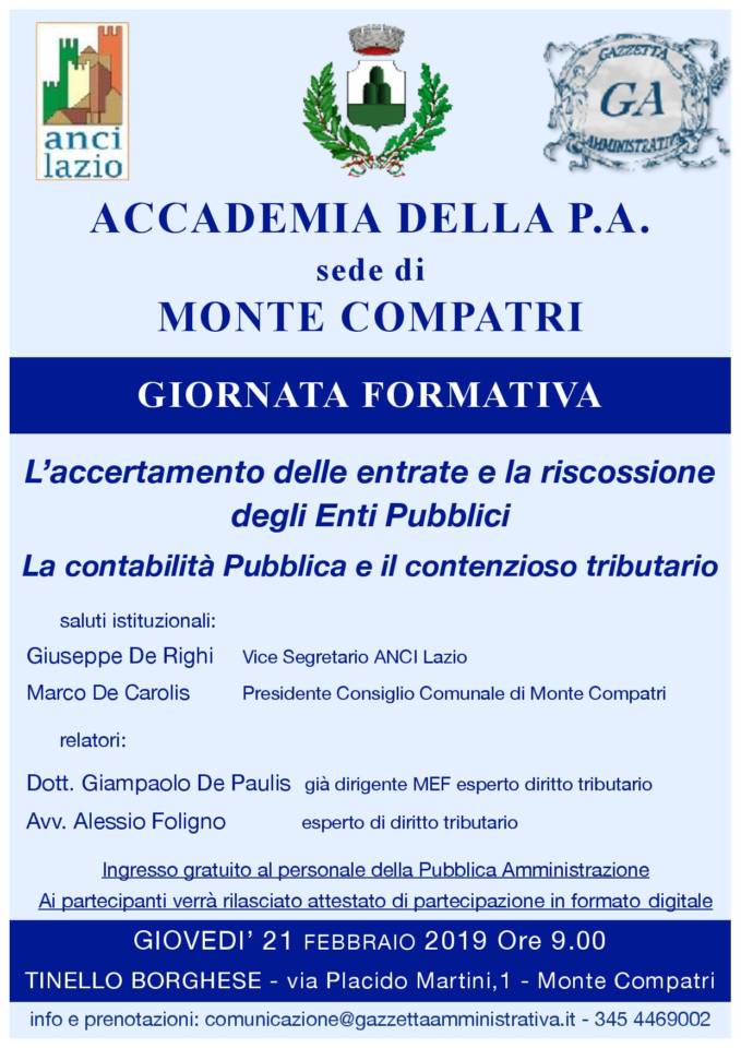 ACCADEMIA DELLA P.A., ENTRATE E CONTABILITÀ PUBBLICA: LA GIORNATA FORMATIVA DEL 21 FEBBRAIO A MONTE COMPATRI