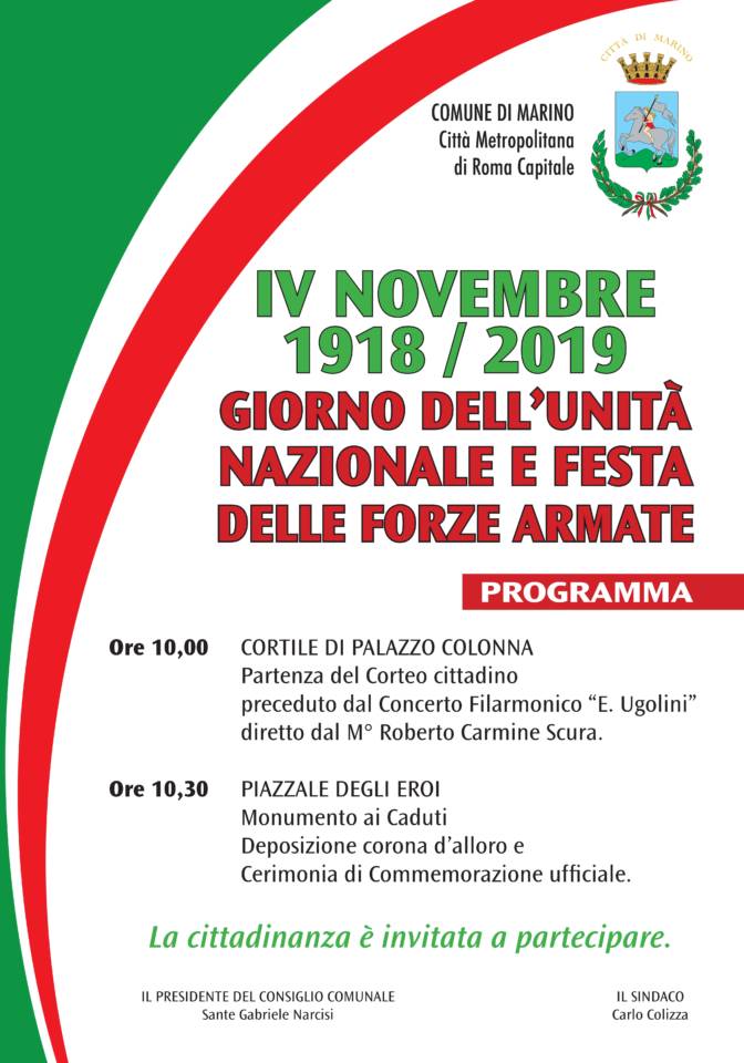 Avrà luogo domenica 4 novembre 2019 la manifestazione promossa dal Comune di Marino in occasione del 101° anniversario della fine della 1^ Guerra Mondiale, della Giornata dell’Unità Nazionale e della Festa delle Forze Armate. Alle ore 10,00 partirà da Palazzo Colonna il Corteo, preceduto dal Concerto Filarmonico “E. Ugolini” diretto dal M° Roberto Carmine Scura, che vedrà la partecipazione del Sindaco Carlo Colizza, degli Assessori e dei Consiglieri Comunali unitamente alle altre autorità civili, militari e religiose convenute e ad una folta rappresentanza degli alunni ditutte le scuole del territorio. Interverranno anche i rappresentanti delle Associazioni A.N.P.I. e A.N.P.P.I.A. Il Corteo percorrerà il centro storico della città fino ad arrivare a piazzale degli Eroi dove, alle 10.30 si terrà la Cerimonia di commemorazione ufficiale con la deposizione della corona d’alloro presso il Monumento ai Caduti. “In vista della importante ricorrenza l’Amministrazione comunale – ha dichiarato il Sindaco – già da qualche anno ha avviato un’opera di bonifica, di pulizia e di sistemazione dei cosiddetti “luoghi della memoria” per permetterne la fruizione da parte dei cittadini. Presso il Barco Colonna, infatti, esiste un luogo di grande interesse storico, meglio conosciuto come Parco della Rimembranza, dove è stata posta una lapide in marmo, realizzata nel 1927, contenente i nomi di 120 caduti nella Prima Guerra Mondiale, che i cittadini che lo desiderano possono visitare”.