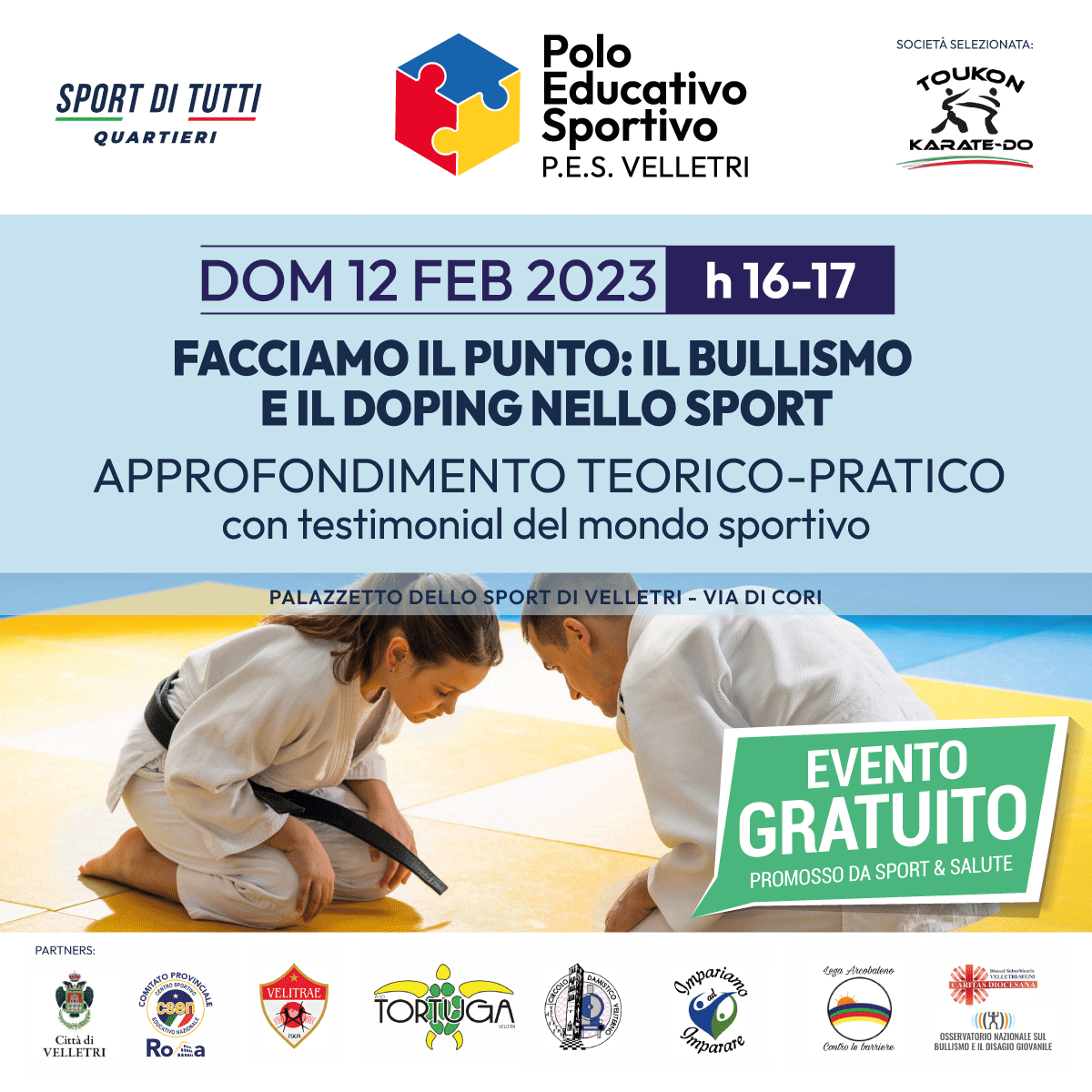 Il Progetto P.E.S. Velletri è promosso da Sport e Salute nell’ambito del Progetto Sport di Tutti Quartieri, vinto dall’Asd Toukon Karate-Do in partenariato con le Associazioni e Organizzazioni partner Asd Ag Velitrae, Asd Circolo Damistico Veliterno Dlf Velletri, Asd Tortuga, Aps Impariamo ad Imparare, Caritas Diocesana Velletri-Segni, Lega Arcobaleno contro le barriere Velletri, Osservatorio Nazionale Bullismo e Disagio giovanile Onlus, Csen Roma, Comune di Velletri.