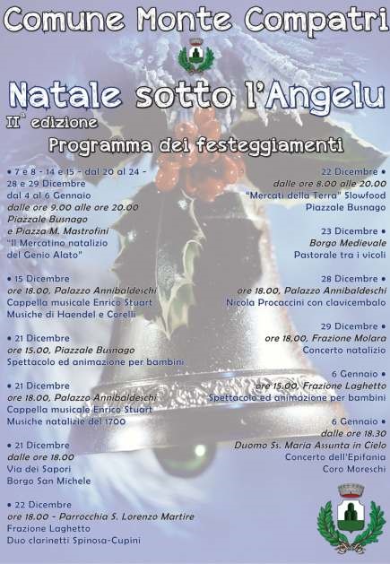 “Nel mese di Dicembre non mi resta che augurarvi i migliori auguri di buon Natale e felice anno nuovo consigliandovi di passarlo con noi negli eventi che verranno organizzati dalle associazioni del territorio e direttamente dal Comune di Monte Compatri – spiega il primo cittadino Marco De Carolis. – In questo momento economico così delicato per gli Enti Locali siamo riusciti comunque a tenere alto il nome di Monte Compatri dedicando numerosi eventi per la Comunità e per i turisti che verranno a trovarci”.