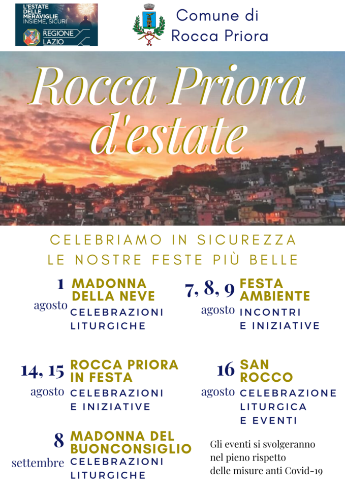 Rocca Priora torna a celebrare le sue feste più belle e lo farà con un calendario di appuntamenti da agosto a settembre. Ecco tutte le feste da segnare in calendario e prossimamente verranno date le informazioni anche sulle singole iniziative: Si partirà sabato Primo Agosto con le tradizionali celebrazioni liturgiche per la Madonna della Neve, mentre nel fine settimana successivo, dal 7 al 9 agosto, in città si terrà alla prima edizione di “Festa Ambiente”, incontri ed iniziative dedicate a nuovi stili di vita eco sostenibili. Il 14 e 15 agosto ci sarà “Rocca Priora in Festa”, celebrazioni e iniziative che anticiperanno le iniziative dedicate al Santo Patrono San Rocco, festeggiato il 16 agosto. Infine l’8 settembre ci saranno le celebrazioni liturgiche in omaggio alla Madonna del Buonconsiglio. Le iniziative, realizzate con fondi comunali e con il contributo “Eventi delle Meraviglie 2020″ della Regione Lazio, saranno organizzate nel pieno delle misure anti Covid-19 previste dal DPCM del 14 luglio e dalle Linee guida della Regione Lazio”. Lo rende noto il Comune di Rocca Priora
