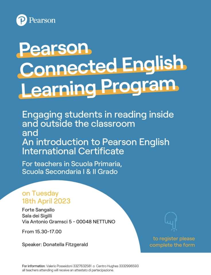 La prossima iniziativa caratterizzata in tal senso sarà il Secondo Seminario di Formazione ed Informazione “Pearson Connected English Learning Program”, rivolto ai docenti di lingua inglese delle scuole pubbliche primarie e secondarie di I e II grado. L’incontro formativo si terrà il 18 aprile dalle 15.30 alle 17.00 all’interno del Forte Sangallo di Nettuno, nella Sala dei Sigilli.