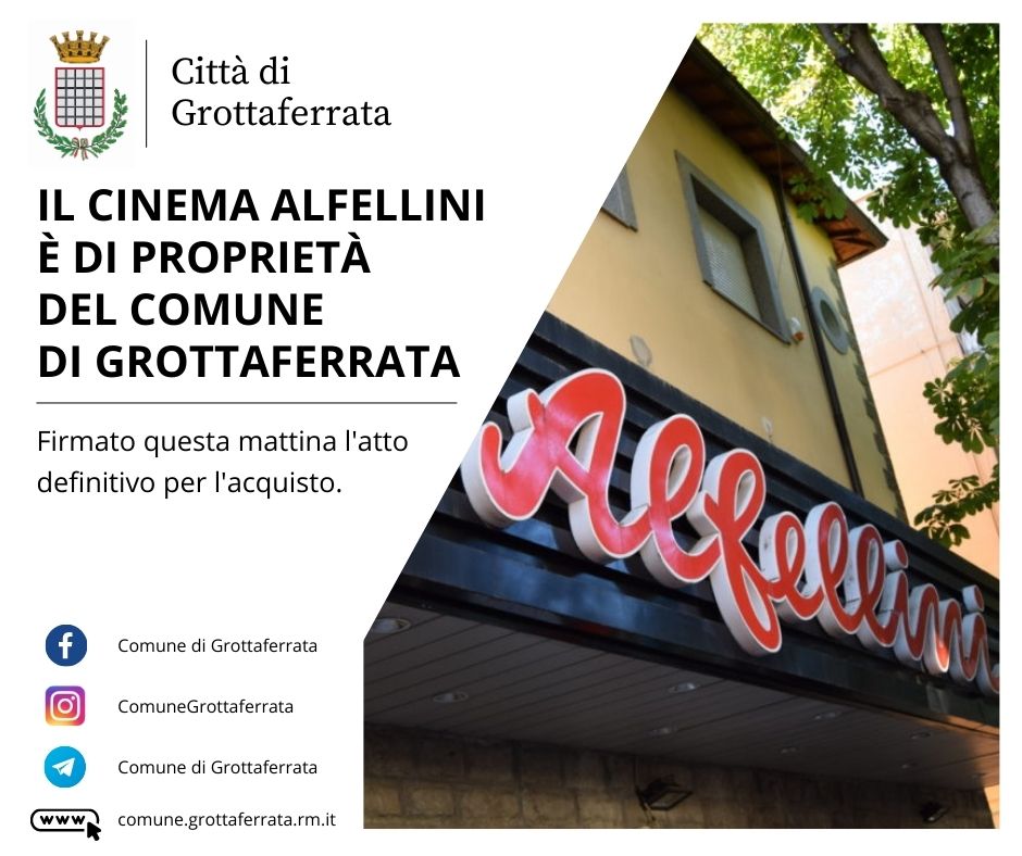 Il Comune di Grottaferrata ha assunto definitivamente la proprietà del Cinema Alfellini. Con la firma dell’atto definitivo si conclude ufficialmente l’iter amministrativo per l’acquisto della struttura, che diverrà presto una sala polifunzionale per attività culturali e un Teatro-Cinema comunale a disposizione dei cittadini di Grottaferrata.