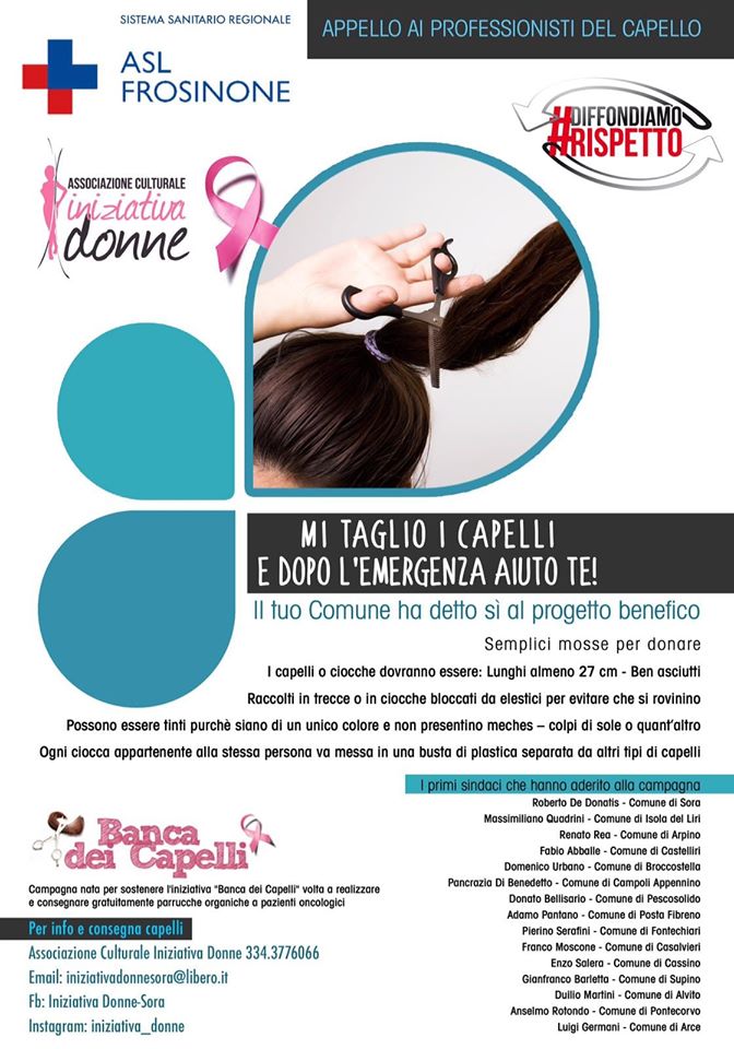 “Il Comune di Arce aderisce alla Banca dei Capelli. Il Sindaco Luigi Germani e l’Assessore alla Cultura Sara Petrucci hanno formalmente aderito alla nuova campagna di sensibilizzazione lanciata dall’associazione culturale no profit “Iniziativa Donne” di Sora. Il progetto sostiene l’iniziativa denominata “Banca dei capelli” con un’importante mission sociale e cioè quella di mettere a disposizione dei pazienti oncologici, che ne facciano richiesta, delle parrucche inorganiche realizzate con la donazione di ciocche di capelli che rispondono a determinate caratteristiche. «Con grande piacere – ha detto il vicesindaco Sara Petrucci – l’Amministrazione comunale di Arce ha raccolto l’invito dell’associazione “Iniziativa Donne”. Siamo oltremodo convinti – ha aggiunto la Petrucci – che anche attraverso piccoli gesti, come un taglio dei capelli, sia possibile alleviare la sofferenza non solo fisica ma sopratutto psicologica che la malattia oncologica reca con se. In queste settimane di emergenza sanitaria poi – ha concluso l’Assessore – abbiamo un ulteriore modo concreto per diffondere la cultura della solidarietà e adoperarci fattivamente per chi sta portando avanti la sua battaglia contro la malattia». Nei prossimi giorni anche ad Arce sarà possibile donare i propri capelli per la bella iniziativa solidale. Il Sindaco, infatti, inviterà i parrucchieri e le parrucchiere del proprio Comune a partecipare alla raccolta benefica. I capelli, che potranno essere naturali o tinti ma non mesciati, dovranno essere ben asciutti, di una lunghezza minima di 27 centimetri e prima del taglio dovranno essere raccolti con due elastici alle estremità di una treccia. Sarà poi l’associazione “Iniziativa Donne” a curare la spedizione delle ciocche raccolte alla “Banca dei capelli”. Per informazioni e chiarimenti l’associazione sorana risponde al numero 334.3776066″. Lo riferisce il Comune di Arce.