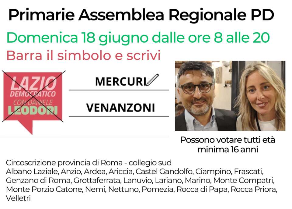 Il consigliere comunale marinese, dottor Gianfranco Venanzoni, è candidato in accoppiata con la dottoressa Marianna Mercuri all’Assemblea Regionale del Partito Democratico nella lista “Lazio Democratico” per Daniele Leodori segretario regionale del Pd. La candidatura è valida nella circoscrizione provincia di Roma – collegio sud che comprende i Comuni di Albano Laziale, Anzio, Ardea, Ariccia, Castel Gandolfo, Ciampino, Frascati, Genzano di Roma, Grottaferrata, Lanuvio, Lariano, Marino, Monte Compatri, Monte Porzio Catone, Nemi, Nettuno, Pomezia, Rocca di Papa, Rocca Priora, Velletri. Le votazioni si terranno domenica 18 giugno dalle ore 8 alle ore 20 e potranno votare tutti i cittadini purché abbiano compiuto sedici anni.
