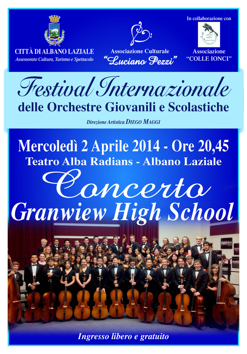 Mercoledì 2 aprile alle ore 20:45, presso il Teatro Alba Radians di Albano Laziale va in scena il “Festival Internazionale delle Orchestre Giovanili e Scolastiche” con l’esibizione della ‘Granview High School’. L’evento è stato organizzato dal Comune di Albano Laziale, in particolare dall’assessorato Cultura, Turismo e Spettacolo in collaborazione con l’AssociazioneCulturale “Luciano Pezzi” e l’Associazione “Colle Ionci”. L’ingresso libero e gratuito e la direzione artistica è affidata a Diego Maggi.