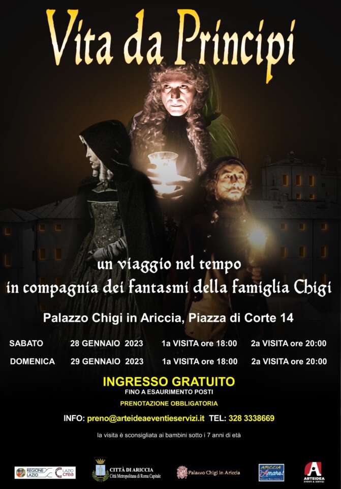 Sabato 28 gennaio e domenica 29 gennaio, alle 18 per la prima visita e alle 20 per la seconda, torna infatti “Vita da Principi” a Palazzo Chigi: lo spettacolo/visita è un viaggio nel tempo in compagnia dei fantasmi della famiglia Chigi e sarà estremamente suggestivo e coinvolgente per i visitatori, i quali potranno attraversare tre secoli di vita quotidiana di una famiglia che ha segnato la Storia. Le visite saranno effettuate solo al raggiungimento di minimo 25 visitatori per gruppo. La prenotazione è obbligatoria, sempre ai riferimenti 328 3338669 o preno@arteideaeventieservizi.it. L’evento è consigliato per i ragazzi di età superiore ai 7 anni.