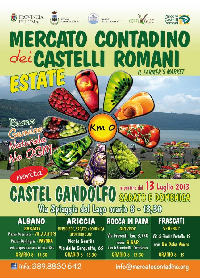 Ricordiamo a tutti che il Mercato Contadino dei Castelli Romani continuerà a svolgersi durante tutta l’estate, in contemporanea con Castel Gandolfo, anche ad Ariccia, Monte Gentile, presso il parco dello Sporting Club (via delle Cerquette, 65) dalle ore 8,00 alle 13,30, il mercoledì, il sabato e la domenica, e ad Albano il sabato a piazza Guerrucci (di fronte alle Poste) e a Pavona in piazza Berlinguer, a Rocca di Papa, il giovedì in via di Frascati km.3,750, a Frascati il venerdì, via di Grotte Portella, 12 area Tor Vergata. (fino alle ore 15).