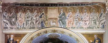 L’arco trionfale, che divide la navata centrale dal presbiterio, riservato ai monaci, è decorato da un mosaico medioevale (XII secolo). Esso rappresenta la Pentecoste: le figure dei santi Apostoli, riconoscibili dalle scritte in greco, sono schierate su seggi preziosi con al centro il trono vuoto in attesa del Cristo per il Giudizio (etimasia); le figure dei santi, ieratiche e impassibili secondo lo stile bizantino, esprimono il distacco dalle cose terrene; nel trono vuoto al centro è raffigurato un agnello, simbolo del Cristo sacrificato, ai lati gli apostoli Pietro e Andrea, simboli di Roma e Costantinopoli.