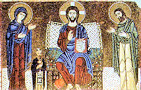 Mosaico della Dèisis Il portale della BasilicaLa porta è detta ‘speciosa’ per la ricca decorazione degli stipiti, a bassorilievo in marmo con intarsi di pietre e pasta vitrea. In stile romanico con influssi bizantini, presenta le ante in legno scolpito di diversa larghezza, riadattate forse da un altro edificio. Il mosaico sovrastante, in stile bizantino del XI secolo, rappresenta la ‘Dèisis’, cioè l’intercessione: Gesù benedicente seduto in trono con il Vangelo di s. Giovanni dove, in greco, è scritto: “Io sono la porta, chi per me passerà sarà salvo”; ai lati la Madonna e s. Giovanni e, in proporzioni minori, la figura di un monaco.