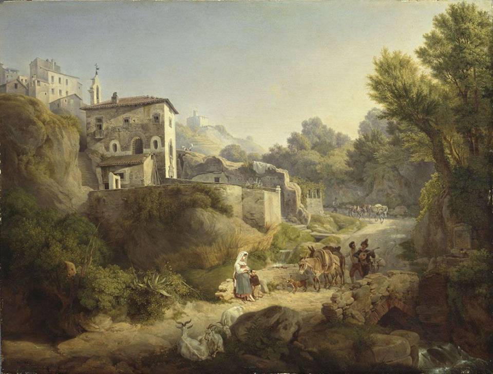 Nel cosiddetto viaggio del “Grand Tour” in Europa così come in Italia, per visitare le antiche rovine del mondo classico, molti furono i poeti, i pittori, gli scrittori e anche i semplici rampolli dell’aristocrazia europea che a partire dai racconti del “Diario di viaggio “ di Montaigne sino al più recente “Viaggio in Italia” di Goethe, fecero la loro visita anche nei Castelli Romani e nella stessa Marino, lasciandone dei ricordi straordinari nelle loro opere sia letterarie che pittoriche. Conosciamo infatti i paesaggi e le vedute di quel tempo grazie a quei capolavori oggi conservati nei maggiori musei del mondo, basti qui ricordare le vedute di Gerard Dughet o quelle del Vanvitelli oggi nel Corridoio Vasariano della Galleria degli Uffizi di Firenze e nella Galleria Colonna a Roma.E’ proprio sulle orme di questi grandi autori che fiorì nell’Ottocento la passione per questi luoghi, testimoniata da altrettanti capolavori come li ritroviamo nelle vedute del visconte di Senonnes pubblicate a Parigi nel 1820,dove si possono riconoscere luoghi quasi dimenticati come la Chiesa di San Rocco, distrutta dai bombardamenti della Seconda Guerra Mondiale, l’antico Lavatoio d’Ammonte e lo stesso Santuario della Madonna dell’Acqua Santa. A quest’ultimo luogo è ascrivibile un dipinto oggi custodito ed in mostra nella Nuova Pinacoteca di Monaco di Baviera.Si tratta di un’opera giovanile di un grande pittore tedesco, Peter von Hess che, nel 1817 si trovava in visita a Roma (Colosseo) e nei Castelli Romani come Castelgandolfo, Ariccia, Genzano, Tivoli, Subiaco e la stessa Marino, potendone riconoscere i luoghi nei suoi disegni e soprattutto uno in modo particolare in un dipinto: il Santuario della Madonna dell’Acqua Santa. Nella sua rappresentazione etnografica della scena, quasi una fotografia, Hess dà una anticipazione di quella sua arte che lo condurrà alla corte di ben due re, Ludovico I di Baviera e del figlio Ottone di Wittelsbach che diverrà primo re di Grecia, e dai quali ebbe l’incarico di rappresentare le scene della rivoluzione greca nella Guerra d’indipendenza dall’Impero ottomano. Proprio per questa destrezza nel rappresentare le scene di guerra , fu chiamato nel 1839 alla corte dello Zar Alessandro II per rappresentare le battaglie napoleoniche in Russia (Smolensk e Borodino), oggi all’Hermitage di San Pietroburgo o la Battaglia delle Nazioni al Maximilianeum di Monaco in Germania. Ed è appunto accanto a queste grandi scene che oggi possiamo ammirare il meraviglioso dipinto del Santuario Mariano al quale sino a non molto tempo fa era stata attribuita una errata denominazione ”San Marino”, come appare nelle pubblicazioni dell’Ottocento,riconoscibile senza ombra di dubbio, quasi ne fosse una rappresentazione “cinematografica”. E’ infatti da notare come la facciata si presenti ancora nel suo impianto seicentesco e con la scalinata di trentaquattro gradini scolpiti direttamente nella roccia ancor prima di quei lavori eseguiti per la realizzazione del nartece dal grande architetto Matteo Lovatti che nel 1818 ne aveva ricevuto l’incarico dal canonico Francesco Fumasoni Biondi. Lavori che invece sono ben evidenti in un altro importante quadro del pittore austriaco George Pezolt che giovanissimo immortalò la nuova facciata. Il luogo sacro dedicato ad una antica immagine della Madonna, affrescata direttamente sulla roccia ,in un luogo millenario per l’estrazione del peperino, la pietra albana, è legato per tradizione ad una sorgente di acqua viva. Studi recenti però lasciano intendere che si tratti di un ramo di antico acquedotto (Augusto?)di cui si sono trovati dei cippi acquari a monte della città e dove vari toponimi mostrano ancora l’esistenza di condotti antichi (Caput Aquae e Pozzo Calvino).La stessa gran quantità di acqua che si nota alla base del dipinto e la presenza a ridosso del Santuario di un antico cunicolo in muratura che sormonta ancora lo stesso Fosso detto delle Pietrare o di San Bonaventura,danno ulteriore consistenza all’ipotesi di un antico acquedotto mai studiato sinora.