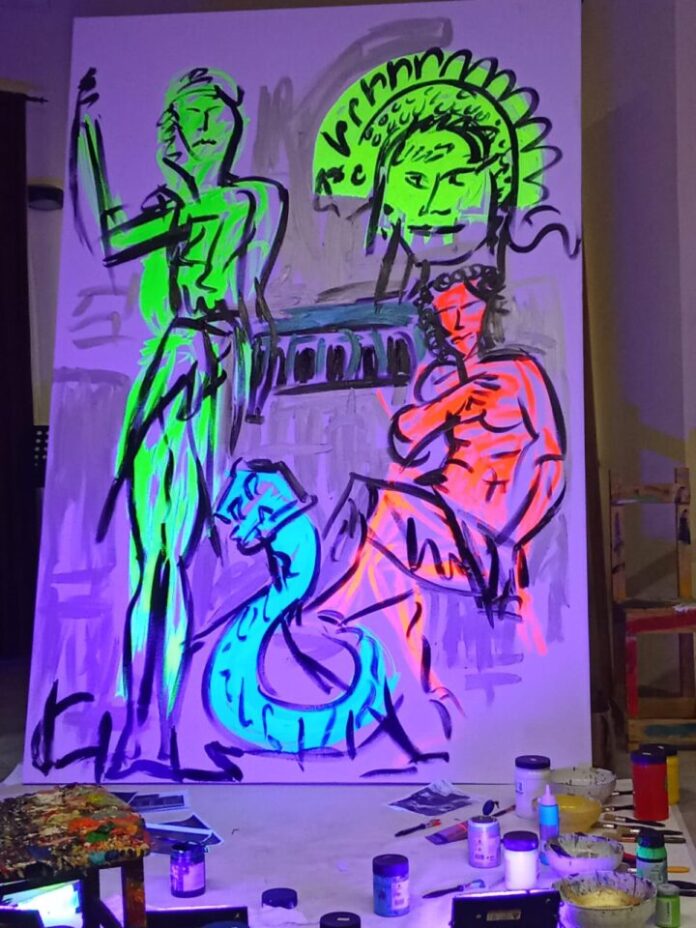 «Ogni quadro è una memoria, una sensazione, un’emozione radicata nei luoghi che amo» racconta il pittore. «Ho voluto rendere omaggio a Giunone Sospita e Dioniso, unendo mito, storia e arte contemporanea in un racconto visivo che coinvolge anche il pubblico. Sulla sinistra ho rappresentato la Dea con il serpente sacro, sullo sfondo il tempio e l’antefissa, e sulla destra Dioniso con un omaggio a Leonardo da Vinci.»