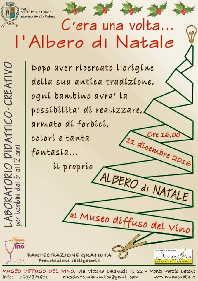 L’associazione culturale Manacubba organizza al Museo diffuso del Vino un laboratorio didattico-creativodedicato a uno dei più importanti simboli natalizi: l’Albero di Natale. Dopo aver ricercato l’origine della sua antica tradizione, ogni bambino avrà la possibilità di realizzare, armato di forbici, colori e tanta fantasia, il proprio Albero di Natale!