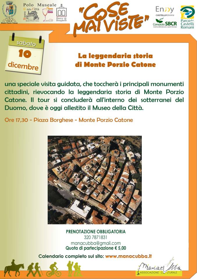 L’associazione culturale Manacubba organizza una speciale visita guidata, che toccherà i principali monumenti cittadini, rievocando la leggendaria storia di Monte Porzio Catone. Il tour si concluderà all’interno dei sotterranei del Duomo, dove è oggi allestito il Museo della Città.