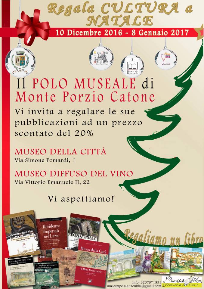 Dal 10 dicembre 2016 all’8 gennaio 2017, in occasione delle festività natalizie, sarà possibile acquistare presso i musei cittadini le pubblicazioni del Polo Museale di Monte Porzio Catone con uno sconto del 20%. I musei saranno aperti il venerdì, sabato e domenica con ingresso gratuito.