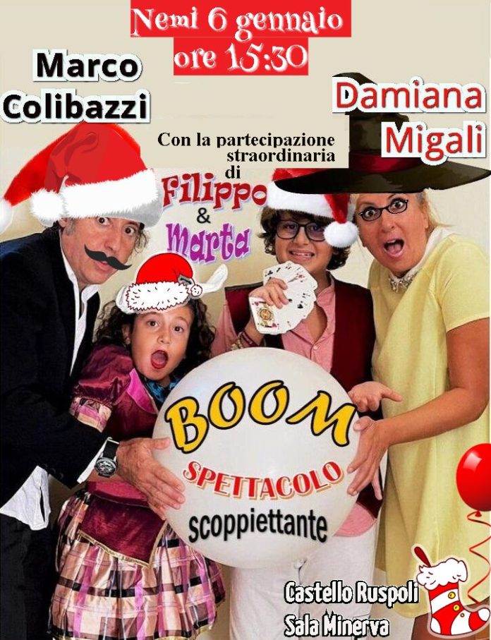 Inizierà sempre coi bambini il nuovo anno 2022, che il 6 gennaio porterà “BOOM”, spettacolo teatrale scoppiettante e animazione, con personaggi particolari e divertenti che necessitano dell’aiuto dei bambini presenti per lasciare ai bambini il ricordo di una befana sempre più amorevole e divertente, pure nel grande gesto del dono delle caramelle e delle calze. a Palazzo Ruspoli, Sala Minerva del castello, ore 15.30. A seguire la distribuzione delle calze ai bambini buoni.