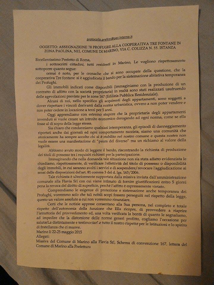 Sarà presentata lunedì 25 maggio nelle mani del Prefetto Gabrielli una raccolta firme prodotta dai residenti del quartiere di Santa Maria delle Mole di Marino, nel quale su provvedimento dell’autorità provinciale nei giorni scorsi sono stati indirizzati 78 immigrati “richiedenti asilo”, nell’ambito della redistribuzione sul territorio nazionale e regionale dei rifugiati giunti in Italia dalle sponde meridionali del Mediterraneo. I 78 secondo l’ordinanza prefettizia, dovranno essere alloggiati presso una palazzina al centro di una zona residenziale sottoposta al vincolo della legge 167, che regola la costruzione di edilizia residenziale pubblica. E’ proprio a questo aspetto che i cittadini marinesi fanno appello nella lettera sottoscrizione che consegneranno al Prefetto, sottolineando il fatto che, le abitazioni di edilizia residenziale pubblica acquisite tramite apposito bando prevedono per gli acquirenti dei paletti precisi secondo i quali per i 5 anni successivi all’acquisizione della casa sono impossibilitati alla vendita ed all’affitto verso terzi. La stessa cosa, si legge nel testo allegato alla raccolta firme, dovrebbe essere sancita per la cooperativa Tre Fontane, che ha acquisito le abitazioni entro le quali dovrebbero essere ospitati i profughi.