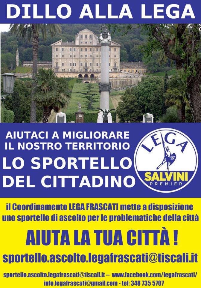 La Lega Frascati, in accordo con il Coordinamento Area Castelli Romani presenterà “Lo Sportello del cittadino”, uno strumento che permetterà ai cittadini di poter segnalare alla Lega le problematiche del proprio quartiere o della propria comunità, in modo che dopo essere stato approfondito, la Lega possa fare da interlocutore nei confronti dell’amministrazione.