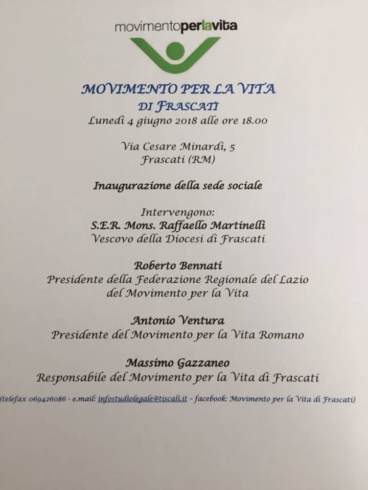 Il MOVIMENTO PER LA VITA organizza Lunedì 4 giugno 2018 alle ore 18.00 presso Via Cesare Minardi, 5 a Frascati (RM) l’inaugurazione della sede sociale. Intervengono: S.E.R. Mons. Raffaello Martinelli, Vescovo della Diocesi di Frascati, Roberto Bennati, Presidente della Federazione Regionale del Lazio del Movimento per la Vita, Antonio Ventura, Presidente del Movimento per la Vita Romano. Presiede i lavori Massimo Gazzaneo, Responsabile del Movimento per la Vita di Frascati