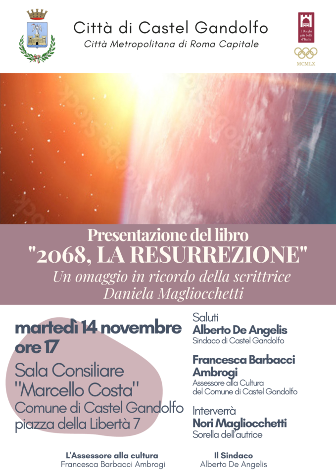 Martedì 14 novembre alle ore 17, ci sarà un pomeriggio dedicato alla scrittrice scomparsa lo scorso anno Daniela Magliocchetti. Un’occasione per parlare di lei e dei suoi romanzi insieme alla sorella Nori, al Sindaco Alberto De Angelis e all’Assessore Francesca Barbacci Ambrogi attraverso una delle sue ultime storie che aveva immaginato e scritto qualche anno fa “2068, La Resurrezione”, prima di lasciarci nell’agosto 2022.