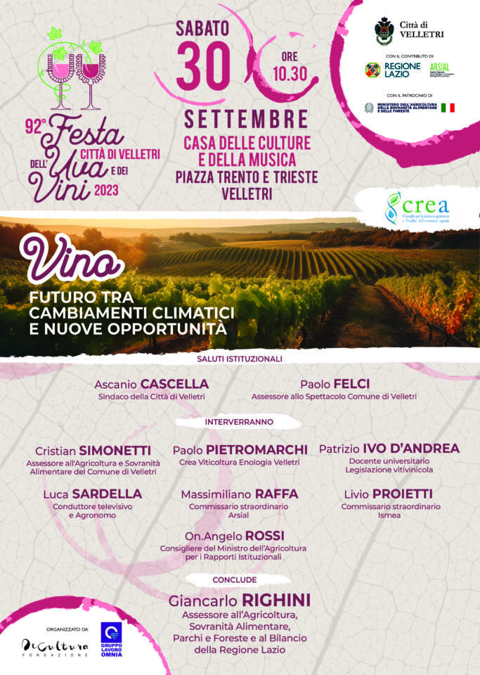 “Vino-Futuro tra cambiamenti climatici e nuove opportunità”. E’ questo il titolo dell’incontro che si svolgerà domani, sabato 30 settembre, dalle 10,30, presso la Casa delle culture e della musica, in piazza Trento e Trieste a Velletri. Il convegno, moderato dal conduttore televisivo e agronomo, Luca Sardella, vedrà la partecipazione del Commissario straordinario dell’Ismea, Livio Proietti, del consigliere del Ministro dell’Agricoltura per i Rapporti Istituzionali, Angelo Rossi, del commissario straordinario dell’Arsial, Massimiliano Raffa, del responsabile del Crea Viticoltura Enologia di Velletri, Paolo Pietromarchi e del docente universitario sulla Legislazione vitivinicola, Ivo D’Andrea. Fra le autorità locali presenti il Sindaco di Velletri, Ascanio Cascella, e gli assessori al turismo ed all’Agricoltura, rispettivamente Paolo Felci e Cristian Simonetti. Le conclusioni saranno affidate all’assessore all’Agricoltura della Regione Lazio, Giancarlo Righini.