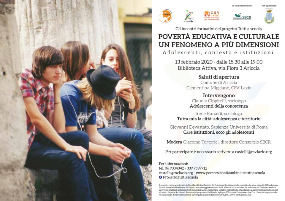 Giovedì 13 febbraio nell'ambito del progetto Tutti a Scuola l'incontro formativo sulla povertà educativa e culturale ad Ariccia