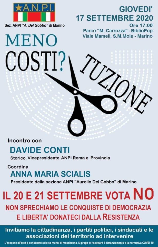 A S. Maria delle Mole, nel parco Maura Carrozza, con distanziamento grazie alle sedie disposte dall’organizzazione di Acab/BiblioPop e ANPI che promuove, ci sarà giovedì 17 alle 17.00 un importante appuntamento dove verranno illustrate le ragioni del NO sulla scheda referendaria del prossimo 20/21 settembre. – spiegano in un comunicato congiunto Mauro Avello di Essere Marino e Stefano Enderle del PCI marinese -. Noi parteciperemo attivamente a questo appuntamento ed invitiamo i cittadini e le forze che sentono di sostenere questa battaglia fondamentale per riportare al centro del confronto non illusori conti della serva, ma le basi portanti del confronto culturale e politico e quindi il cardine della rappresentanza politica elettiva nelle istituzioni del nostro Paese”. Dopo questo giudizio netto, i due esponenti della sinistra marinese, si pronunciano anche sulla attività di conoscenza del tema referendario: “Abbiamo visto tutti, proprio perché in periodo di emergenza sanitaria, che prima il referendum è stato fatto slittare, e, successivamente ha subito l’assenza di un confronto reale perché in coincidenza di periodo covid ed estivo. Dunque è già questo un pessimo modo, dei promotori referendari – che ufficialmente sono i maggiori partiti e movimenti nazionali – di chiamare i cittadini ad esprimersi. In aggiunta, ricordiamo a tutti che poiché è referendum confermativo, non necessita di quorum: cioè i fans dei sostenitori sono oggettivamente avvantaggiati nel voler perseguire ciò che loro stessi promuovono. Quindi i pochi strumenti a disposizione dei sostenitori del NO, a ragion veduta rispetto agli obbiettivi che si vorrebbero perseguire – concludono Avello ed Enderle – sono da un lato informarsi oltre la propaganda televisiva o di internet; scegliere di partecipare al voto e non lasciare ad altri la scelta; quindi, se si condividono i nostri rilievi e considerazioni, votare NO. Per questo vi invitiamo calorosamente con passione e intelligenza a voler partecipare a questo appuntamento che grazie alla sezione ANPI di Marino e alla disponibilità di Acab/BiblioPop che promuove sempre in sicurezza importanti incontri, vedrà la sicura partecipazione di molti soggetti politici e associativi oltre che cittadini attenti responsabili”. (Le sedie saranno distanziate, ma si ricorda di indossare comunque le mascherine)”. Lo rendono noto gli organizzatori.